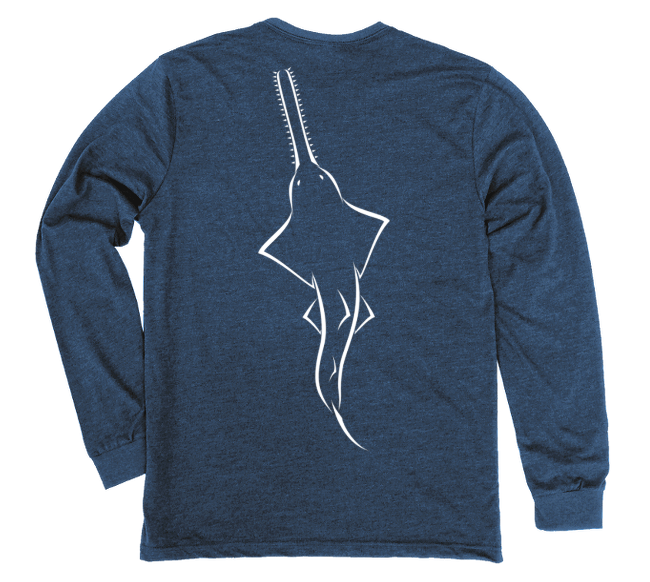 Wear the Sawfish Long Sleeve T-shirt, featuring a unique perspective of a sawfish from above and swimming right up your back. The sawfish design is featured in white ink on the back of a heather navy blue shirt, and a horizontal "Shark Zen" logo is printed in the same color on the front left chest area.