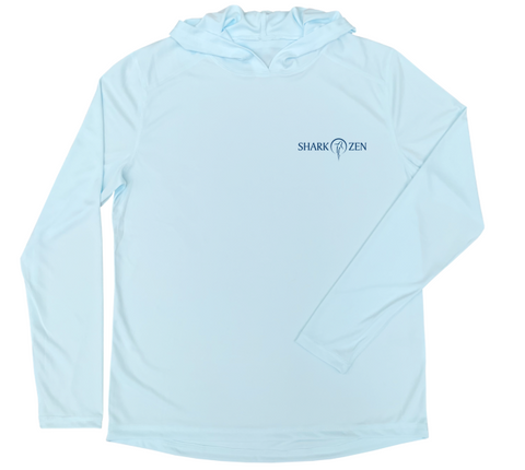 The Hawksbill Sea Turtle Water Camo UV protective performance hoodie will keep you dry and the sun off you for any water-related or outdoor activity. The back of this arctic blue swim shirt features the Hawksbill Sea Turtle design in a water camouflage pattern. The front left chest area features a horizontal Shark Zen logo in navy. The material is an extremely light and comfortable, high quality microfibre.