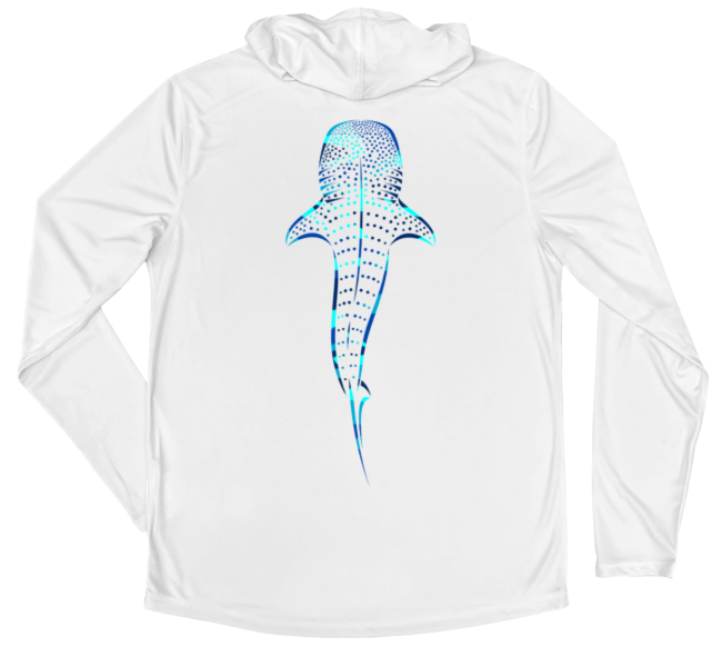 The Whale Shark Water Camo UV protective performance hoodie will keep you dry and the sun off you whether you're boating, kayaking, or for any ocean activity. The back of this white swim shirt features a powerful Whale Shark design in a water camouflage pattern. The front left chest area features a horizontal Shark Zen logo in navy. The material is an extremely light and comfortable, high quality microfibre.