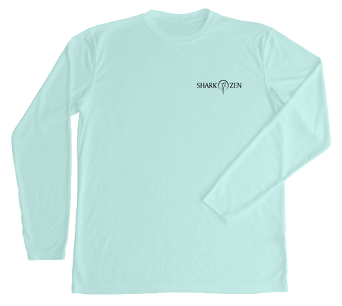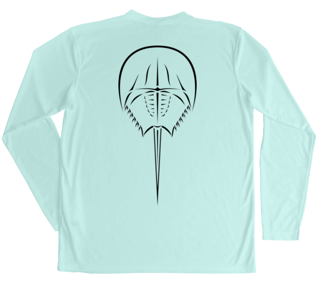 The Horseshoe Crab UV Protective Performance Shirt carries the ancient, quiet strength of this iconic bottom-dweller. Printed on Seagrass performance fabric in black ink, the Horseshoe Crab design appears on the back, with a subtle Shark Zen front left chest logo in the same ink color.