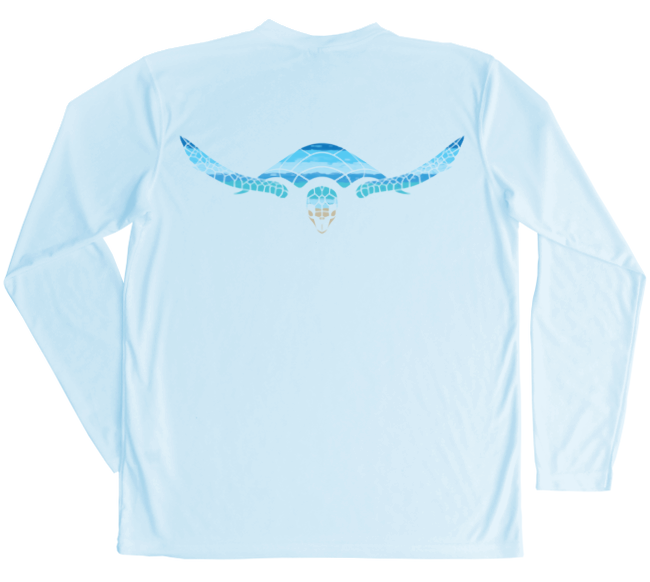 The Hawksbill Sea Turtle Beachscape UV protective performance shirt displays the Hawksbill Sea Turtle with a Beachscape design overlay, speaking to graceful endurance and clarity. The pattern's texture comes from horizontal paintbrush strokes. The multi-colored Beachscape print is displayed on the back of an arctic blue long sleeve performance shirt. A subtle Shark Zen logo in blue, matching a color from the artwork, is featured on the front left chest.