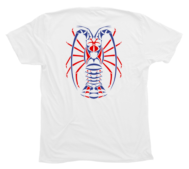 Wear the striking Spiny Lobster red, white, and blue t-shirt to showcase the powerful symmetry of this gorgeous animal. The Spiny Lobster design is featured in red and blue on the back of a white short sleeve t-shirt. A horizontal "Shark Zen" logo is printed in blue on the front left chest area.