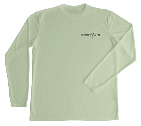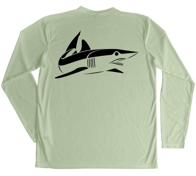 The Mako Shark sun protective performance shirt carries the clean precision of the open water hunter it honors. This version is printed in black ink on a Sage shirt, with the design placed on the back. A matching subtle Shark Zen logo is printed on the front left chest. The material is an extremely light and comfortable, high quality microfibre.