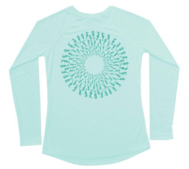 The Seahorse Mandala UV protective performance shirt will keep the sun off you whether you're diving with the seahorses or relaxing on shore. It also dries fast and wicks away sweat. The back of this Seagrass swim shirt features a stylish circular formation of seahorses in tone-on-tone seagrass ink. The front left chest area features a horizontal Shark Zen logo in the same color. The material is an extremely light and comfortable, high quality microfibre.